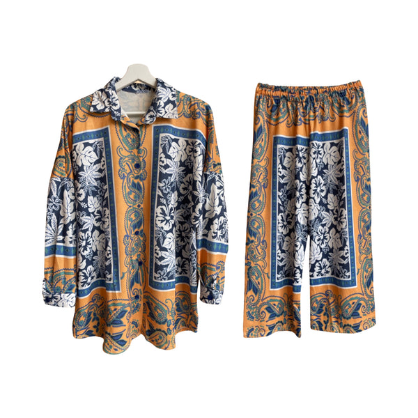 This unisex set includes a yellow and blue patterned long sleeve shirt and matching pants, perfect for any occasion. Available in one size, this stylish oversized set is sure to make a statement with its vibrant colors and versatile design.