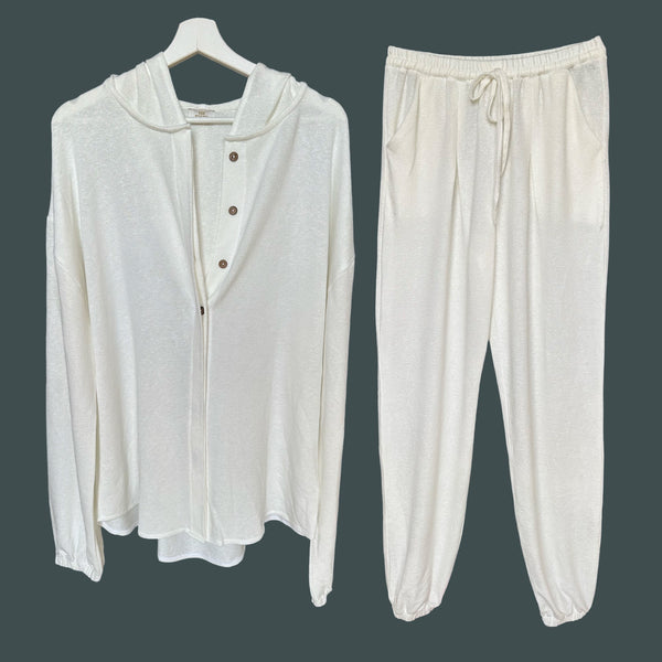 The Cloud Frankie Set features incredibly comfortable and versatile set that provides both comfort and style. Its top can be worn as a cardigan, button-down, or hoodie, making it a 3-in-1 essential for any wardrobe. Its oversized, one-size, and relaxed fit offers flexibility and warmth, and is suitable for both men and women. Available in beige and white options.