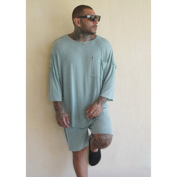 The Cottonwood Set is made of high-quality, soft, and durable beige cotton that provides stretch and comfort. It is designed in an unisex, oversized fit with a quarter sleeve shirt and shredded fabric detailing along the seams. The set comes in one size and includes both the shirt and shorts.
