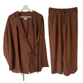 This linen kimono / blazer set comes in a rich chocolate brown color. It can be worn open for a comfortable and relaxed look, or closed with a cross tie for a more stylish appearance. The matching flowy pants add to the versatility of this set. The Kudos Set is a one-size, oversized fit that is designed for both men and women and suitable for sizes XS-L.
