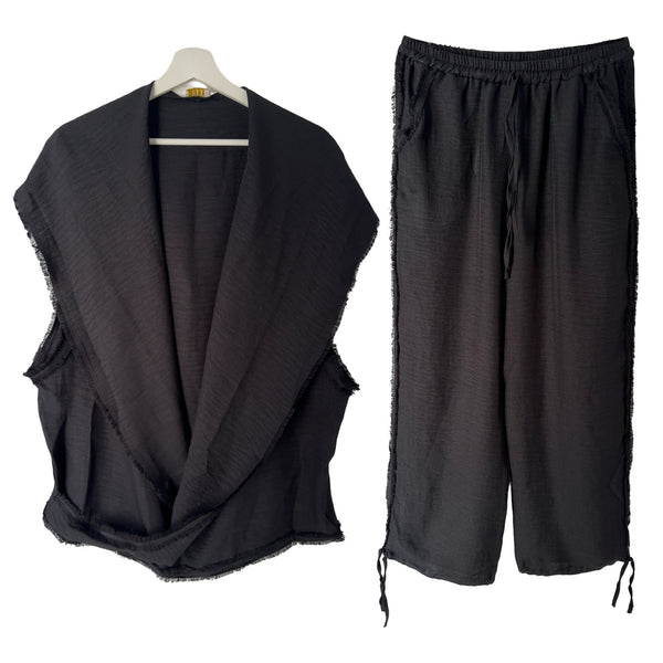 The Layl Set features a black linen hooded cross top and pant set, with added shredded linen detailing along the seams. This one-size set boasts an oversized, relaxed fit and is designed to be unisex.