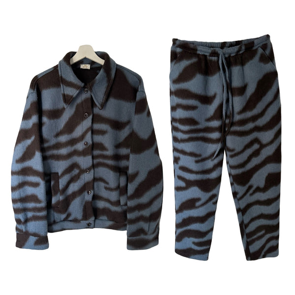 The ‘Mohair’ Set features a wool mohair jacket & pant that is designed to fit both men and women in one size with an oversized fit. This product can easily fit people up to size large and features a color mix of blue and black.