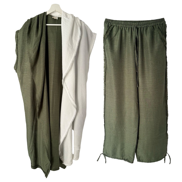 The Olivine set features a sleeveless hooded kimono, crafted from a blend of olive green and white linen with shredded fabric detailing along the seams. Designed to be flowy and oversized, it can accommodate sizes up to XXL and is suitable for both men and women.