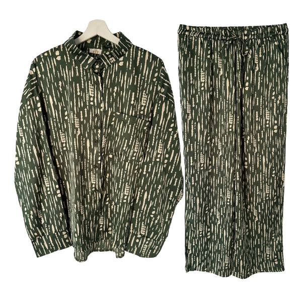 The Safar Set is made with a high quality silk and cotton blend. This set features a long-sleeve shirt and pants that offer a flowy and oversized fit, suitable for sizes XS to Large. Its unisex design makes it versatile for all.