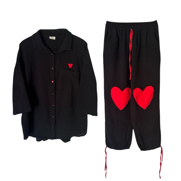The Rebel Set is a part of the “7ob” collection. This set features a short sleeve button down shirt and pants, with red hearts on the knees and a small heart above the pocket of the shirt and for additional detail, a single red button on the shirt. It is designed to have a relaxed fit and is suitable for both men and women up to size XL. Made with a linen and cotton blend fabric for a comfortable and stylish look and perfect for all weather conditions.