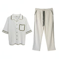 The Riviera Set isΒ a unisex short-sleeve button-down shirt and pant combination, featuring contrasting colors along the seams and edges of both the shirt and pants, including the pocket. The pants are additionally designed with a single back pocket, accented by matching trim.